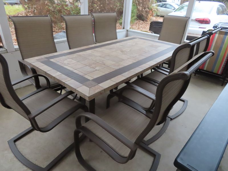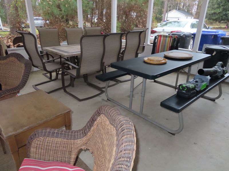 • Furniture incl. Custom Cords Cabinetry cabinet made of solid wood and used as a pantry. Trex glider, Lifetime Picnic table, Sectional sofa, two matching rocker recliners, queen, full and twin size beds, dresser, chest of drawers, night stands, end tables, occasional tables, wardrobe, round table with leaf and 4 chairs, metal rolling cart, coffee table, desk, file cabinet, hutch, drop leaf table, small entertainment stand, stereo cabinet and more!