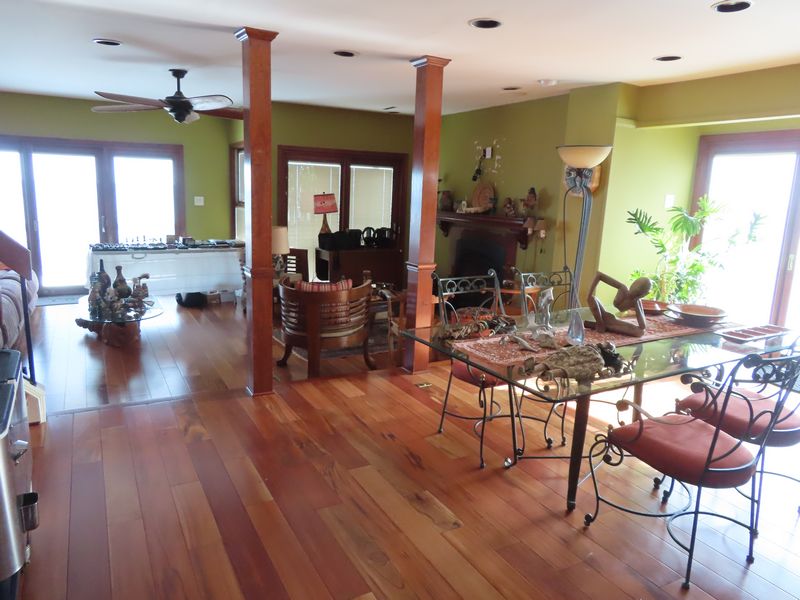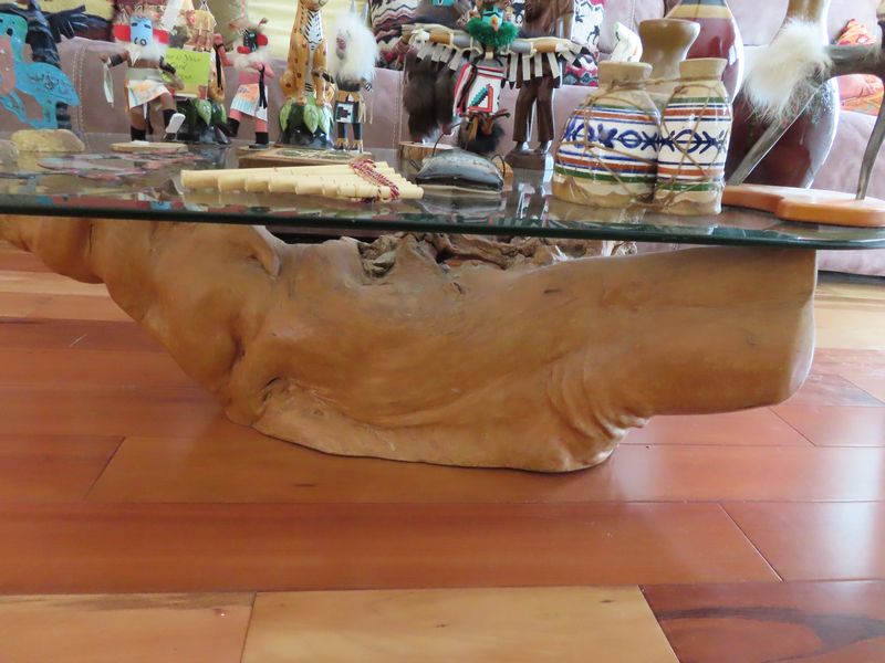 - Furniture incl. Artist signed entry tile top table with metal base and matching mirror, four metal bar stools, glass top dining room table with metal and marble base and four metal chairs, super cool wooden stump base coffee table with glass top, dual reclining oversized couch, drop leaf table, unique occasional chairs, antique Queen beds. Antique dressers, antique secretary, and take end tables.