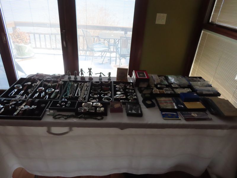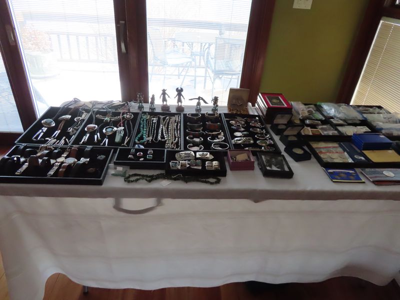 Jewelry incl. Large collection of vintage Southwest/Native American sterling silver jewelry featuring stones such as turquoise, spiney oyster, coral, lapis, tiger eye. Most are signed by the artist and include bolo ties, bracelets, rings, pendants, money clips and large silver chain necklaces.