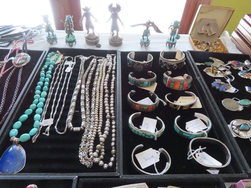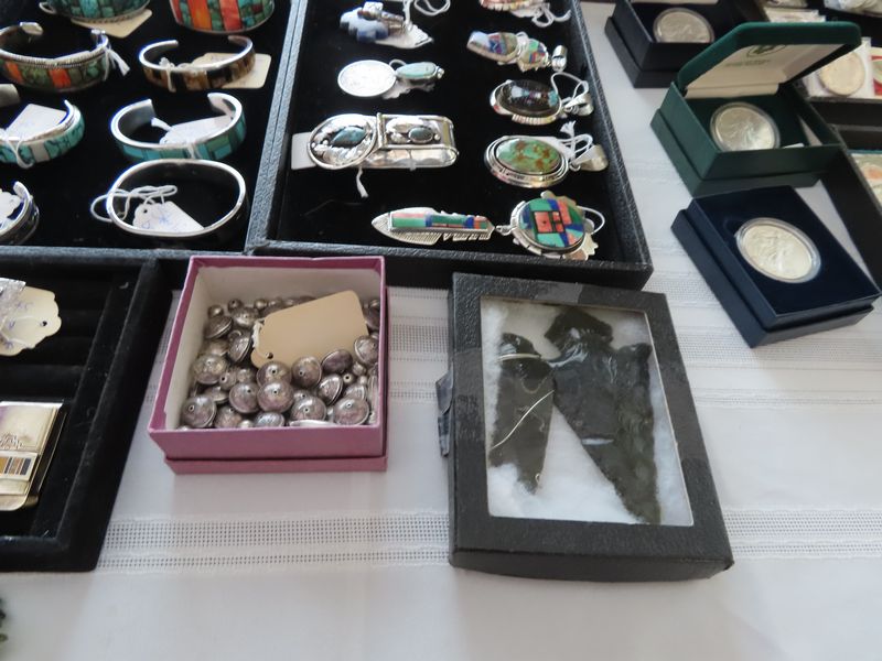 Ancient Obsidian Spearheads, vintage sterling silver Kachina figurines by renowned Navajo artists David Freeland and Tobey Henderson.