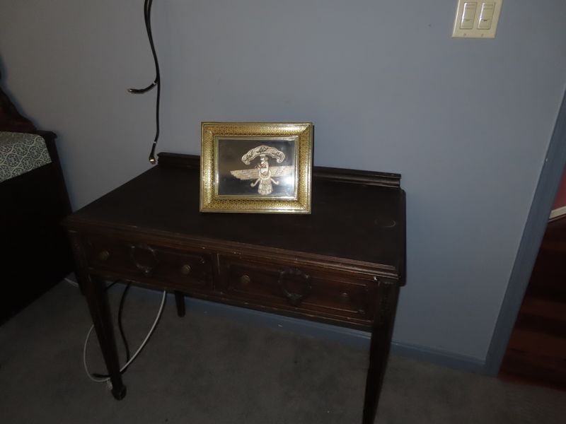 • Furniture incl. Artist signed entry tile top table with metal base and matching mirror, four metal bar stools, glass top dining room table with metal and marble base and four metal chairs, super cool wooden stump base coffee table with glass top, dual reclining oversized couch, drop leaf table, unique occasional chairs, antique Queen beds. Antique dressers, antique secretary, and take end tables.