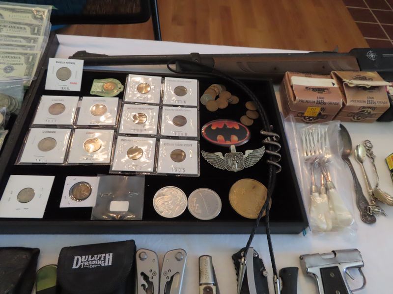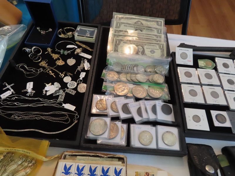 • Coins and paper money incl. Peace and Eisenhower dollars, Walking Liberty, Kennedy and Franklin half dollars, quarters, dimes and braided hair cents. Silver certificates and two dollar bills.