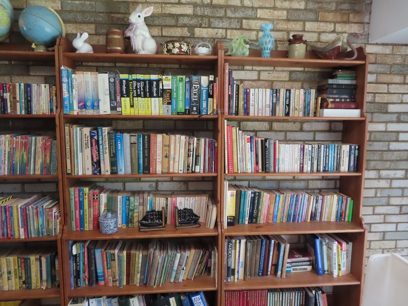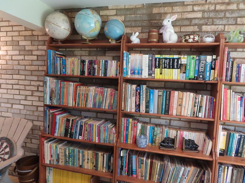 Furniture including solid oak Amish made king size bed with matching nightstands, dressers, and chest of drawers, solid oak hutch and dining room table, Horizontal Unit The Globe Wernicke Co. (catalog number 3313-B. G. D.-14) Barrister bookcase, Curio cabinet, roll top desk, Vintage child’s furnishings. black leather loveseat, chair with ottoman and couch, tv entertainment cabinet, Lane trunk, Dolphin trunk, bookshelves and much more.