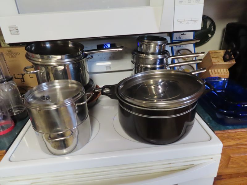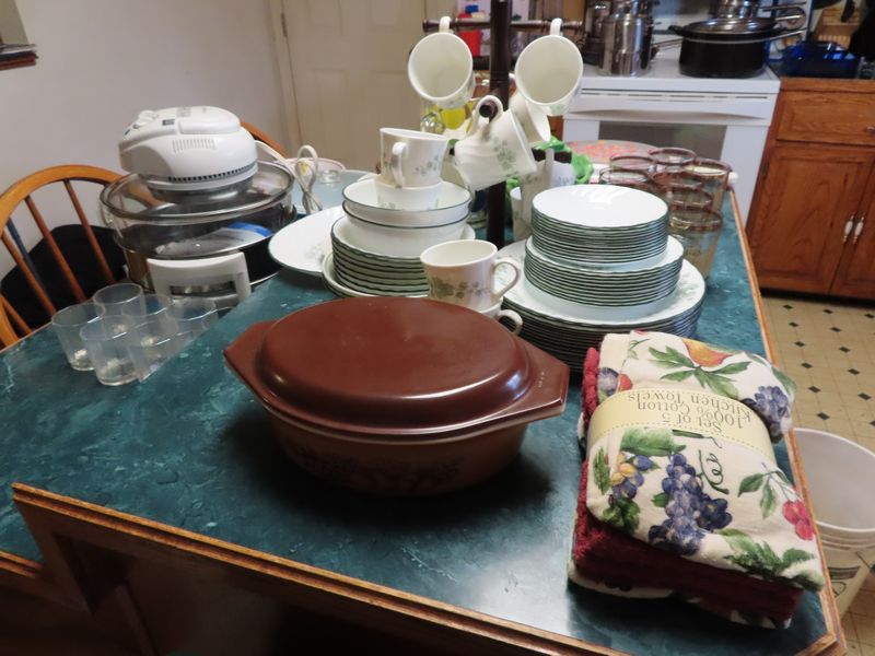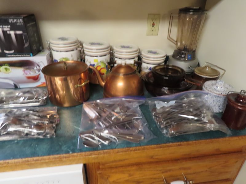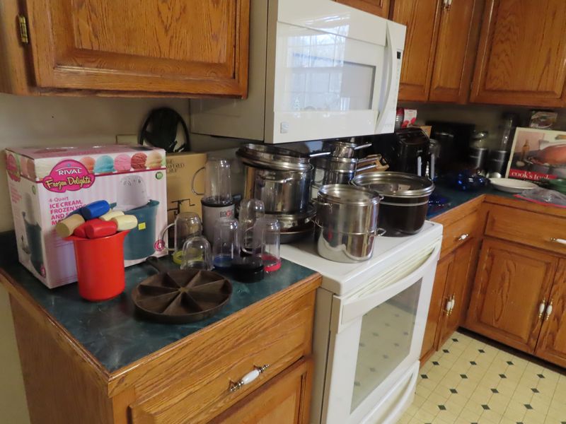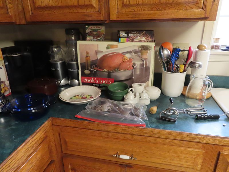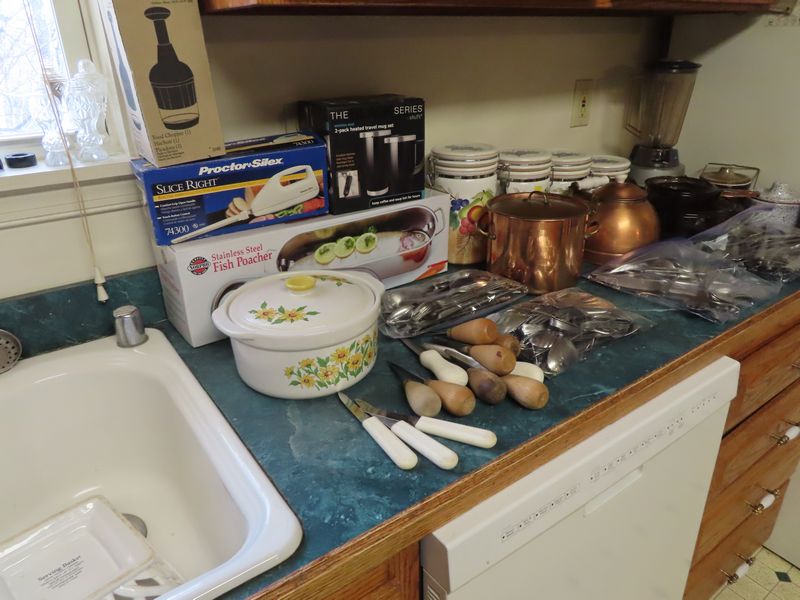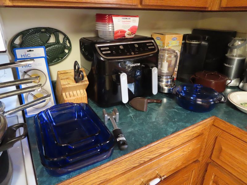 • Kitchen items incl.  Pyrex, Cutco serving, Magic Bullets, Rival frozen yogurt maker, the Pampered Chef apple peeler corer slicer, pots and pans, Cornbread cast iron, Gourmia double air fryer, Keurig, Cooks tools three-piece stainless steel domed roaster, Cuisinart chopper, stainless steel fish poacher, the Pampered Chef food chopper, visionware, Hamilton Beach blender.