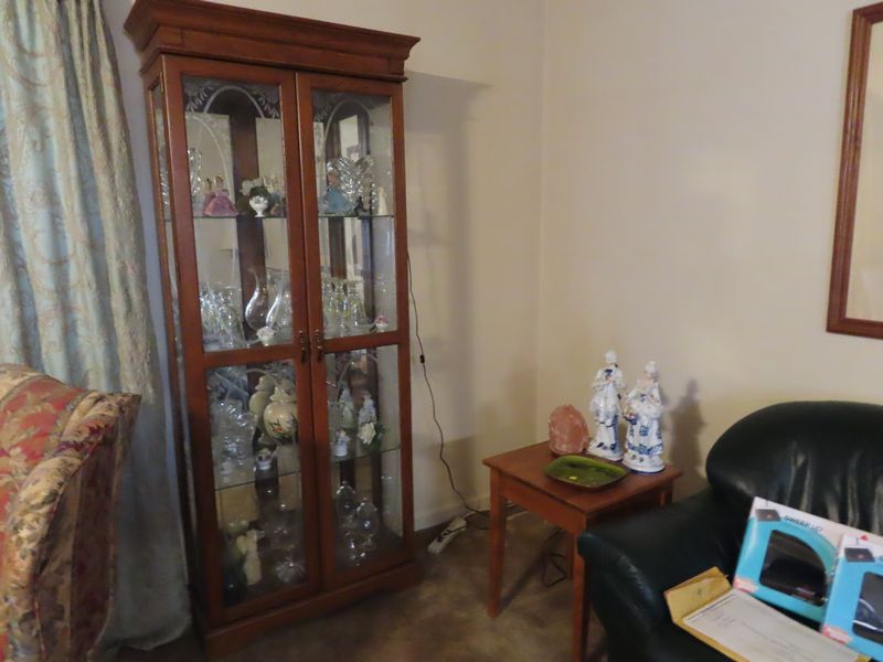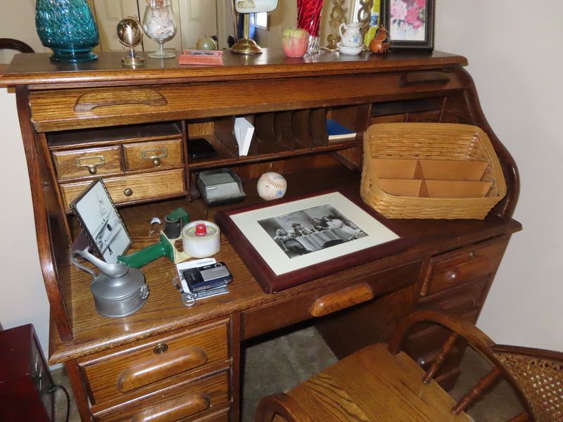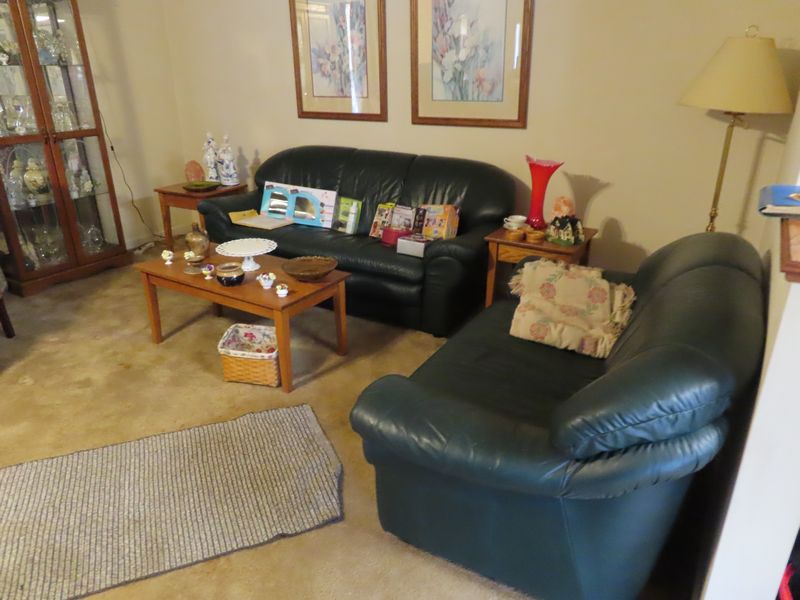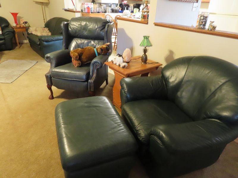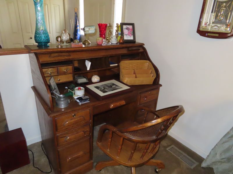 • Furniture incl. Lane solid wood king size watered with matching end tables, dresser with mirror and chest of drawers. Hamway occasional table, Modern full size bed, antique settee with matching chairs in excellent condition. Desks, occasional chairs, office chairs, roll top desk, wingback chairs green leather couch with matching loveseat and chair with ottoman. Green leather recliner. Entertainment cabinet, CD cabinets, solid oak end tables with matching coffee table, lighted display cabinet. Duncan Phyfe dining room table with six chairs and cover, matching buffet and buffet, corner cabinet.
