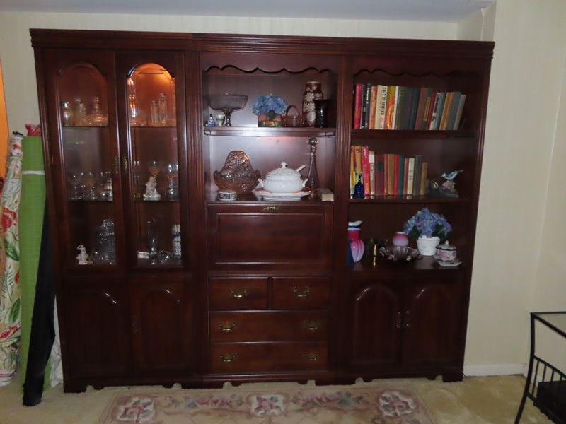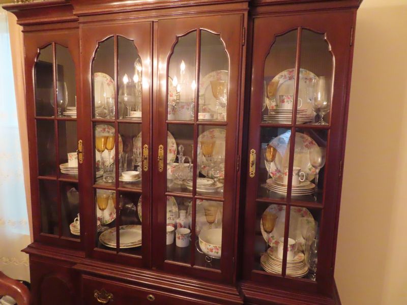 • Furniture incl. Thomasville chest of drawers with matching nightstand and king size bed, lane trunk, antique tiger oak dressers, Stiffel lamps, Thomasville end tables, matching leather wingback chairs, Lenoir house 3 piece display cabinet, Thomasville dining room table with 6 chairs, Thomasville hutch, Thomasville buffet, two matching Flexsteel suede sofas, several Safavieh rugs, Surya rugs, rolling island and much more!