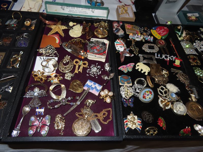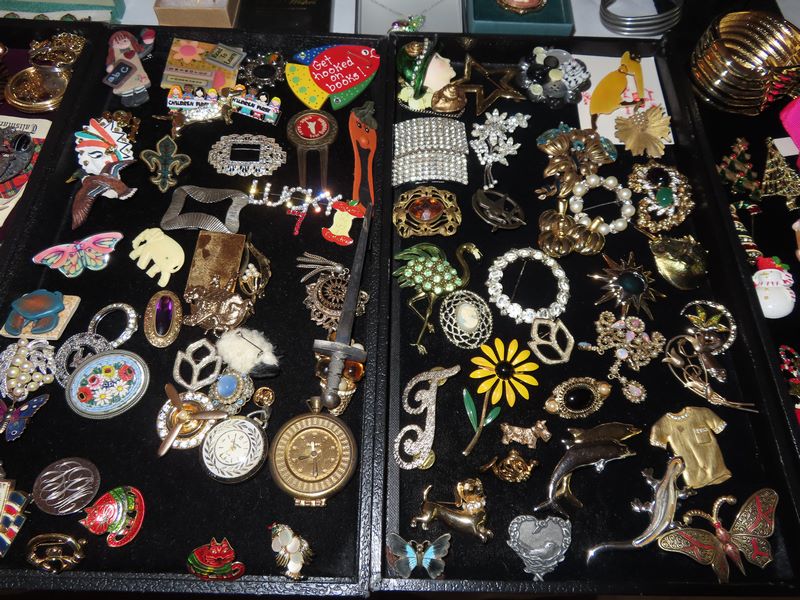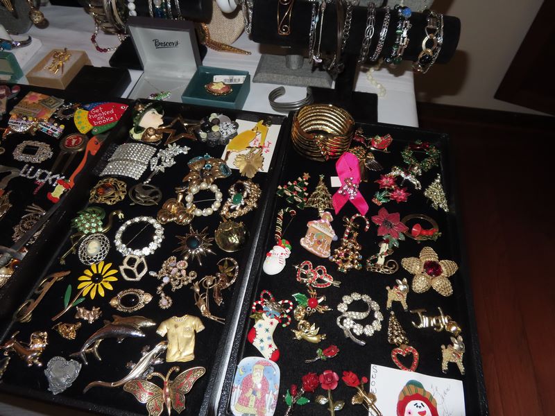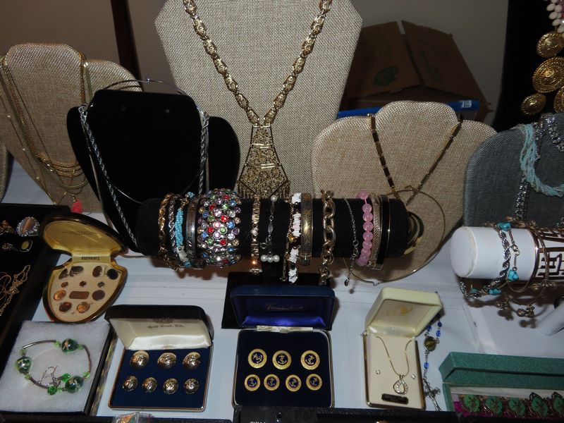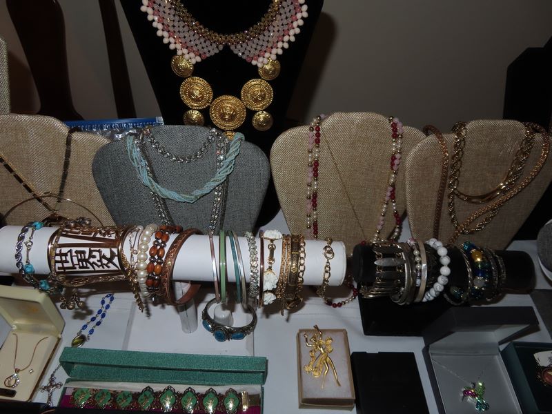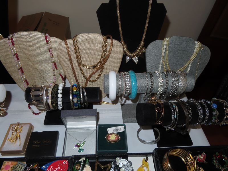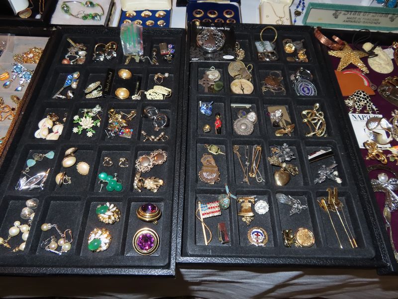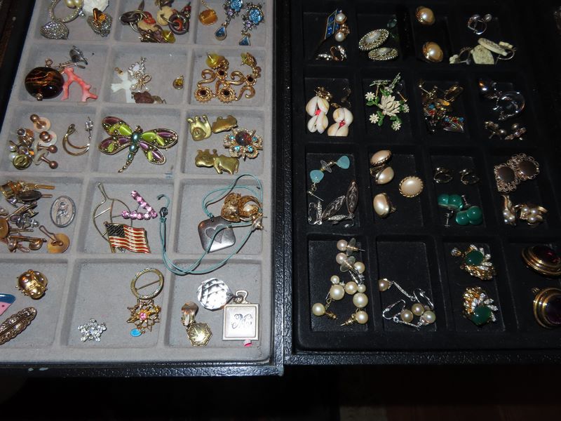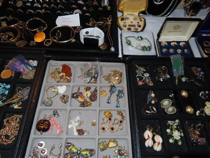 - Jewelry incl. Tons of 10k, 14k, 18k jewelry including earrings, bracelets, rings, necklaces and brooches with incredible stones! Many rings with Diamond, sapphire, jade, amethyst, pearl, topaz, garnet, citrine, tanzanite, ruby, carnelian, lapis lazuli, including several men’s rings. Mikimoto pearls, gold chains and bracelets. Green and lavender jade bracelets, amethyst, sapphire, citrine, and lapis lazuli bracelets. Large pearl and diamond necklace, Pearl, Jade, Onyx, and citrine gold earrings. Many gold brooches with large stones, including jade, citrine, amethyst, lapis lazuli, cameo, pearl topaz. A huge collection of sterling jewelry, including many large pendants with beautiful large, semi precious stones. Lots of sterling chains and bracelets. Earrings with semi precious stones stones such as pearls, garnet, topaz, cameo, carnelian, amethyst, green, Garnet, pink topaz. Silver rings with smoky topaz, pearls, sapphires, amethyst, blue topaz, turquoise, cameo, peridot quartz, citrine. Large collection of costume jewelry, including large statement necklaces, many with semi precious stones and shells and much more!