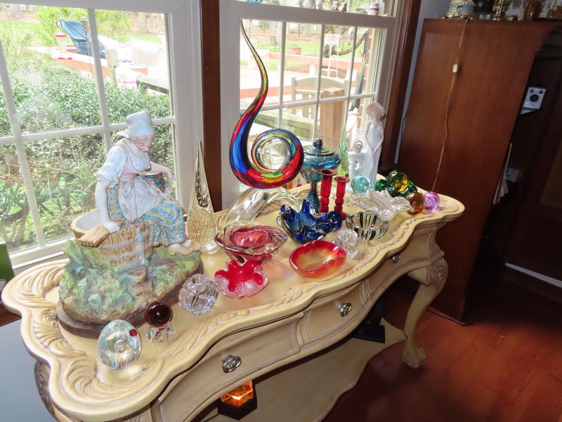 - Pottery, Glass and China incl. Enterprise Pottery Co. 4 gal. stoneware crock, tons…and I mean tons…of MURANO!, Waterford crystal galore, Maryland, Virginia and Carolina Delft tobacco jars, Chalet, stoneware, crocks, Blenko, McCoy, Fenton, 1877 French Gien Faience pitcher and basin, McCoy El Rancho,