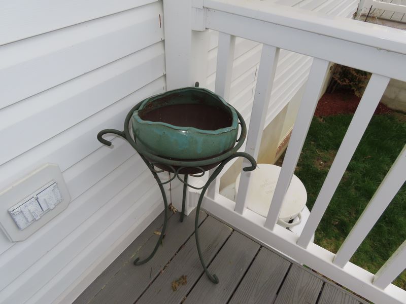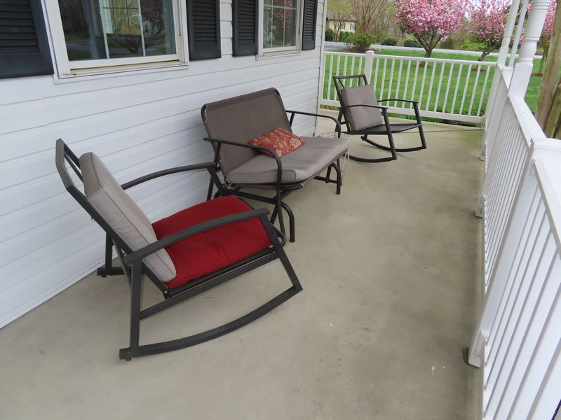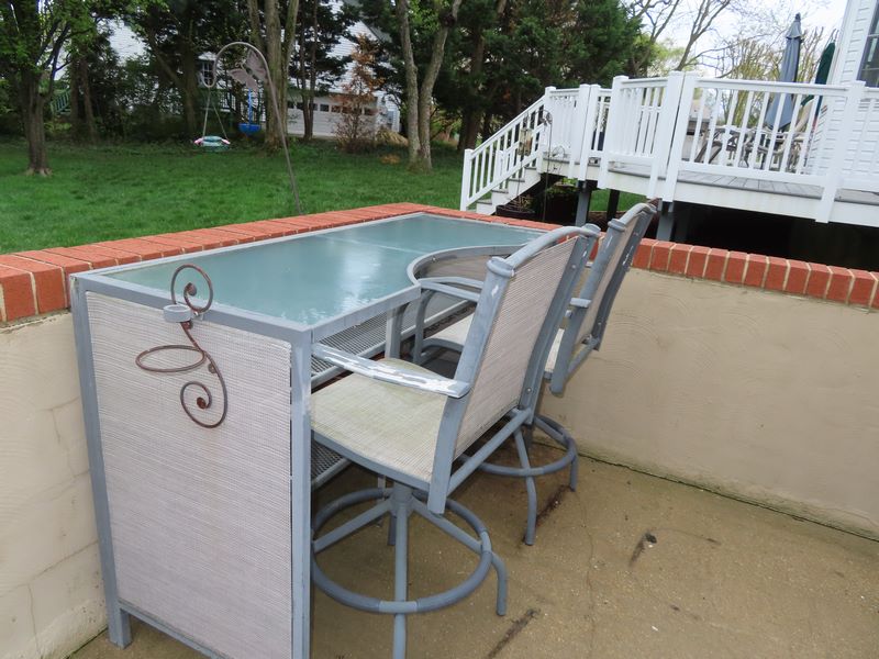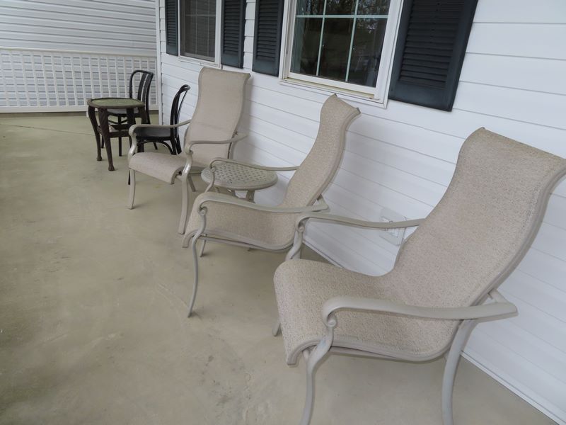 Patio furniture incl. Table Rectangular with umbrella & 4 chairs, and matching side table (round), Zero gravity chairs, Sling chairs (4),Side tables (4), Rocking chair set, deep seats (2)Swivel chair set ,(2)Loveseat, swinging, Cast iron chair, Tiki bar with awning and 2 chairs, Cushions (some brand new), Storage chest for cushions, Cantilevered umbrella, Grill and grill cover, Patio plants, planters (some under the deck), Trivets for planters, hoses – several lengths, Hose caddy, Bird feeder hangers & swing, Bird feeders, Welcome mats and seasonal inserts, “Welcome” sign and more!