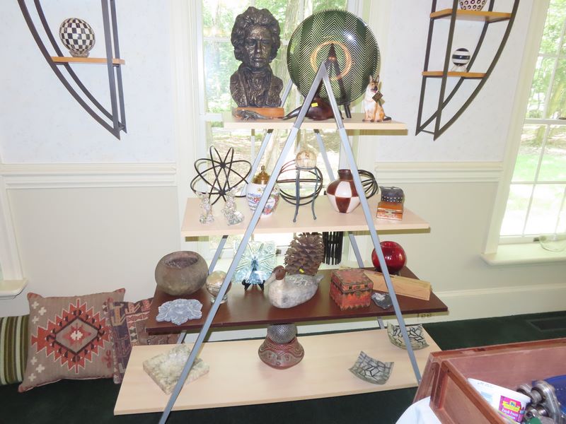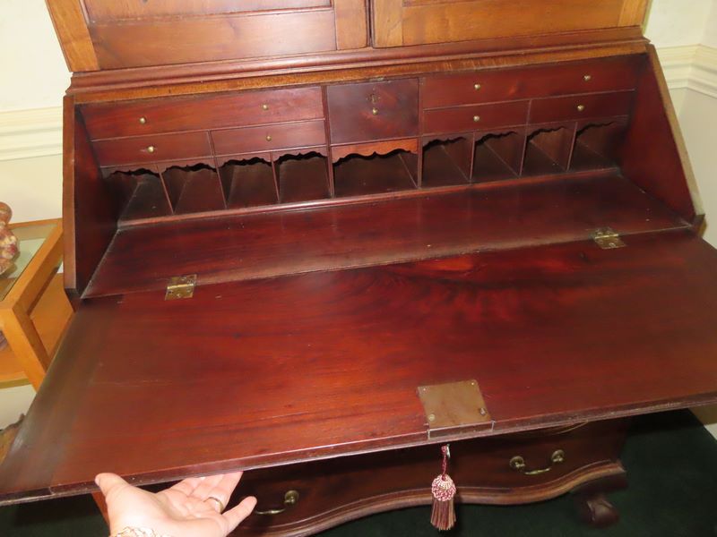 - Furniture incl. Antique French 1800’s walnut armoire, Mahogany frame black webbed lounge chair by Niedermaier with ottoman, American Chippendale Mahogany Oxbow desk with married 18th century Boston secretary, Massachusetts tea table in baroque mahogany reproduced from an original 1750’s style, Antique Chippendale tea table circa 1730-1775, Late 20th Century Vintage Boho Curtis Jere Lily Pad coffee table with glass top, Walnut table with 5 leaves, Step Tansu Chest Set, antique trunks, burlwood flatware chest of drawers, Jacobean buffet, several drop leaf occasional tables, Continental Furniture Co. dresser, Upholstered and leather sofas, chairs and loveseats. 19th Century Pedestal desk, Antique spindle leg parlor table,