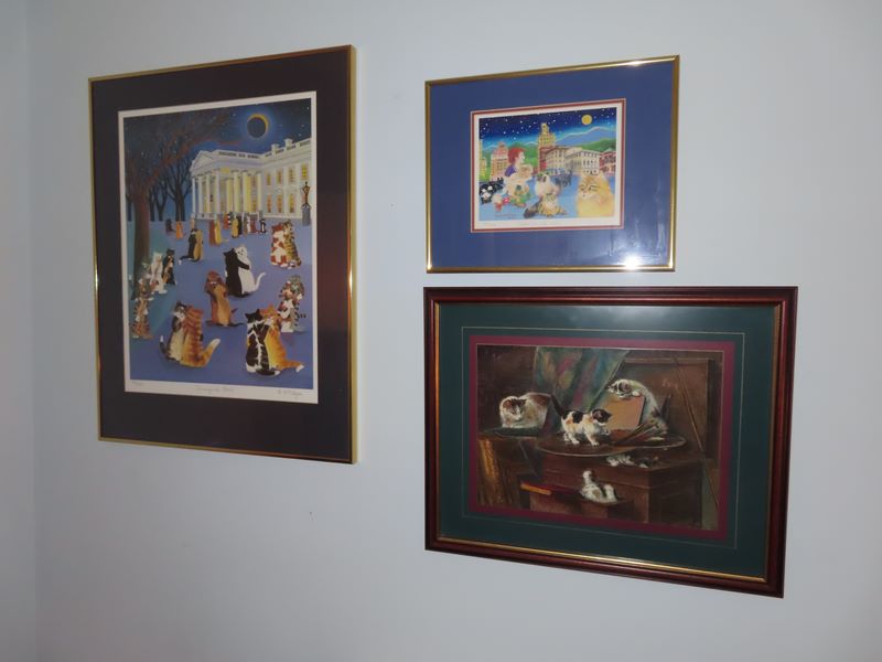 - Art incl. David Rose original oil paintings, Carmen Ruis Wallace “Old Durham” watercolors, Woodblock print “The Great Wave off Kanagawa” by Katsushika Hokusai, Square Wood Calligraphy by Xu Bing, James Dean print with his Porsche 550 Spyder at a gas station right before his crash Sept. 30, 1955, Elizabeth McAfee signed “Political Inaugural Ball” Cat prints, King Oliver’s Creole Jazz Band framed print, Egyptian papyrus “Offering” framed, several prints throughout the home.