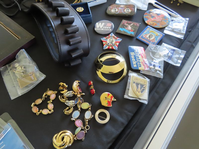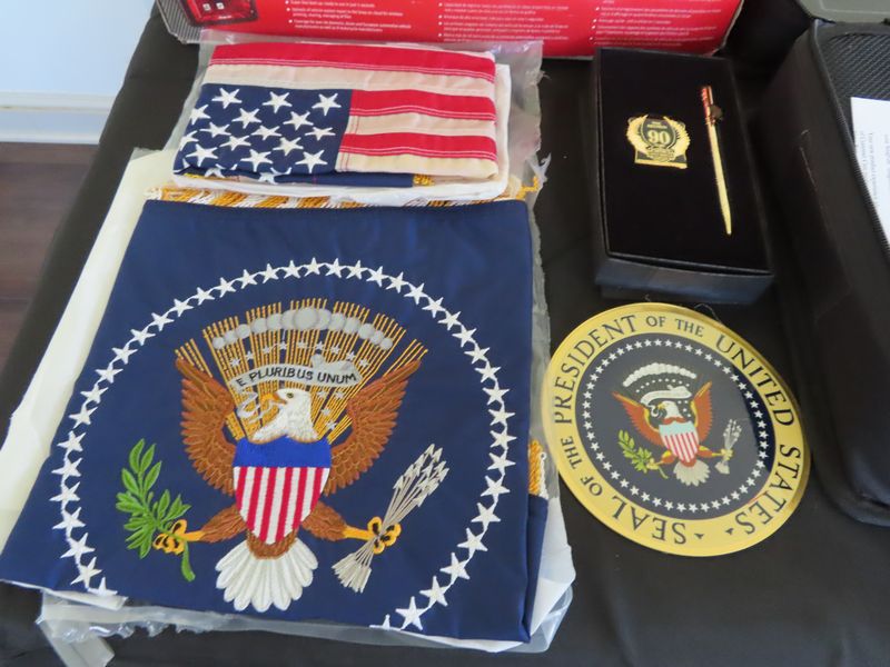 - Large collection of US Secret Service memorabilia including multiple challenge coins and presidential photographs.