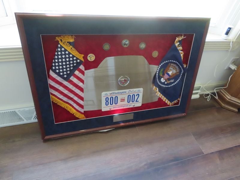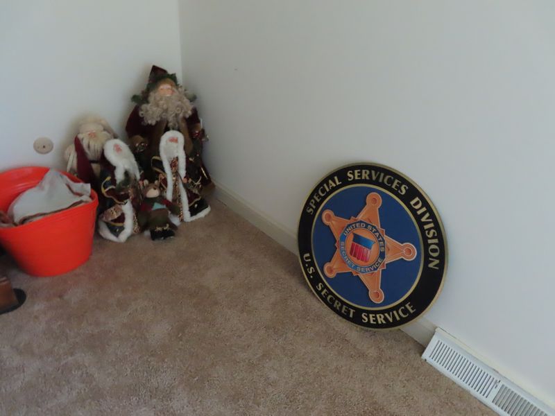 - Large collection of US Secret Service memorabilia including multiple challenge coins and presidential photographs.